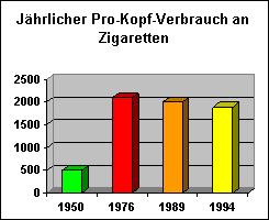 - Die Anzeigenkosten für Zigaretten in Zeitungen und Zeitschriften betrugen 1989 in den alten Bundesländern 89,5 Millionen Euro. Die Ausgaben für Außenwerbung, Kinospots, Direktmarketing, Sponsorship, etc. werden auf 250 bis 360 Millionen Euro geschätzt.